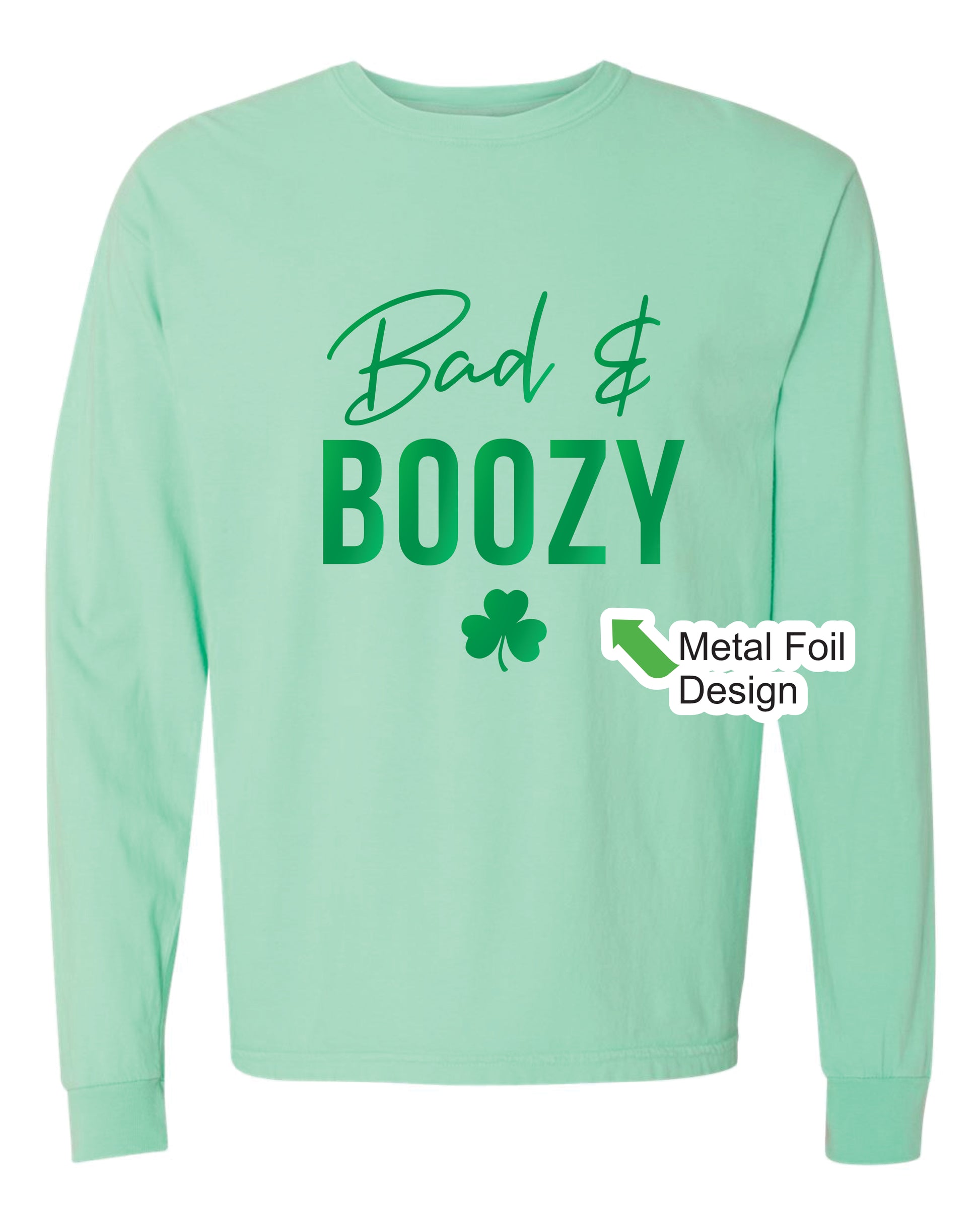 The St. Patrick’s Day Unisex t-shirt features a metal foil design with phrases like “Bad and Boozy". Embrace the festive spirit with this shamrock shirt that’s perfect for celebrating Irish pride and raising a pint of cheer!